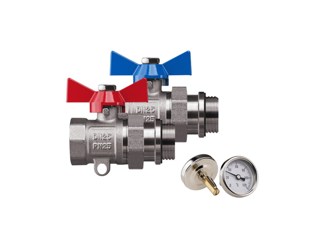 Sada uzavíracích armatur Dewarm 1″ s teploměry - provedení přímé