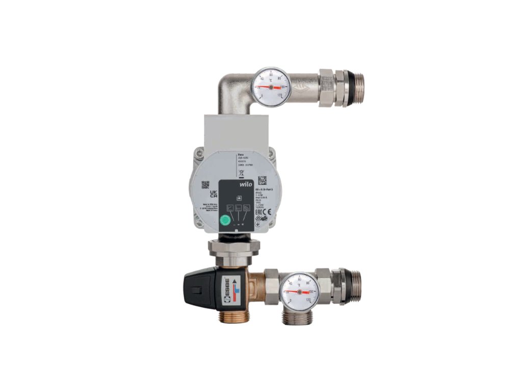 Směšovací čerpadlová sestava Dewarm z niklované mosazi s čerpadlem Wilo Yonos Para a ventilem ESBE VTA 372 pro přesnou regulaci teploty podlahového vytápění v rozsahu 20–50 °C.