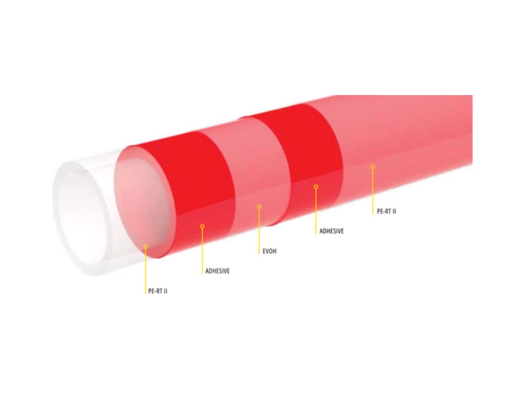 Kombinace vnitřní a vnější vrstvy z materiálu PE-RT II se zvýšenou tepelnou odolností a střední kyslíkové bariéry EVOH zajišťuje vysokou pevnost, pružnost a spolehlivou ochranu topného systému před korozí. Díky nízké hmotnosti a přesné výrobě se potrubí snadno pokládá a dlouhodobě si udržuje tvar i při vyšších provozních teplotách.