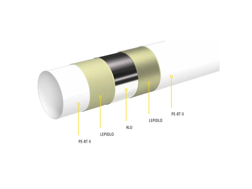 Díky kombinaci plastu a hliníku spojuje výhody obou materiálů – pružnost, nízkou hmotnost a výbornou tvarovou stabilitu. Střední hliníková vrstva svařovaná laserem zaručuje přesnost, pevnost a úplnou nepropustnost kyslíku, zatímco vnitřní a vnější vrstvy z materiálu PE-RT II odolávají vysokým teplotám a tlaku.
